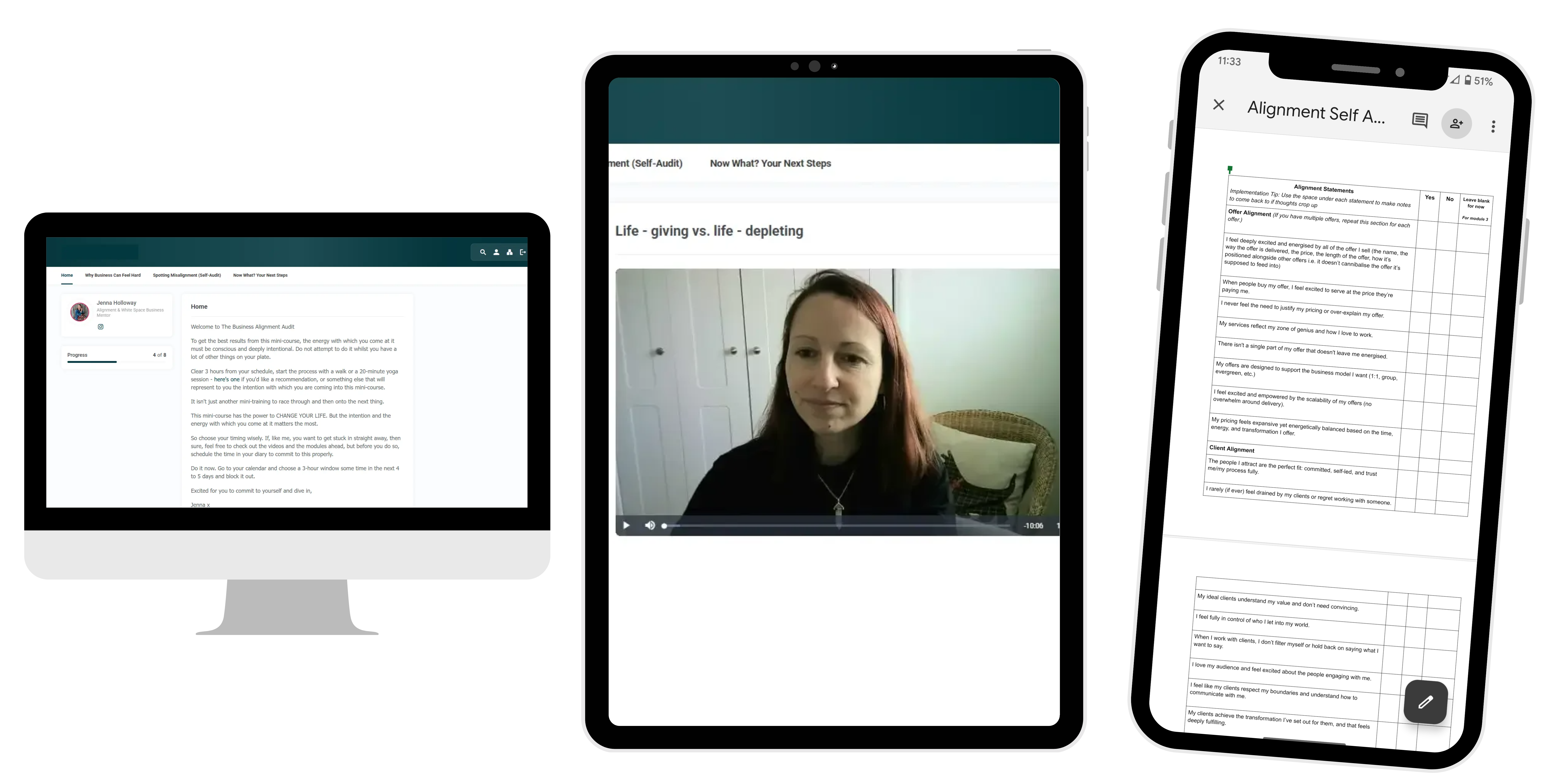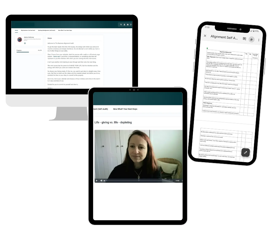 This Business Alignment Audit isn’t a self paced mini course that you’ll consume but then continue on your way having not changed a thing because the whole course was needlessly complex or strung out. (It'll blast the very root cause reasons you were tempted to seek a missing piece in all those other mini-courses and trainings in the first place.)
